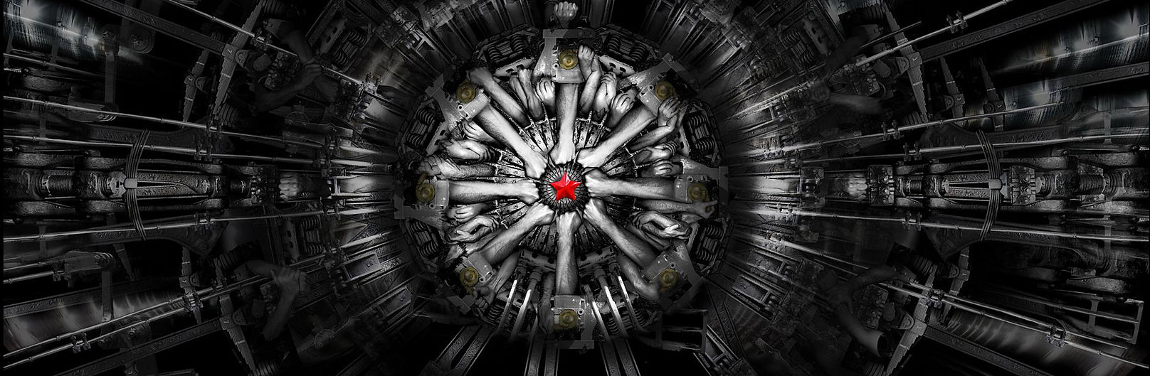 Композиция сложена из деталей старого поезда и человеческих рук.